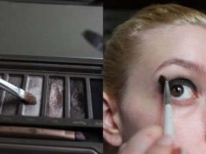 Avec un pinceau plat, je prends du noir mat que j’applique très grossièrement sur toute ma paupière mobile excepté le coin interne de l’oeil.